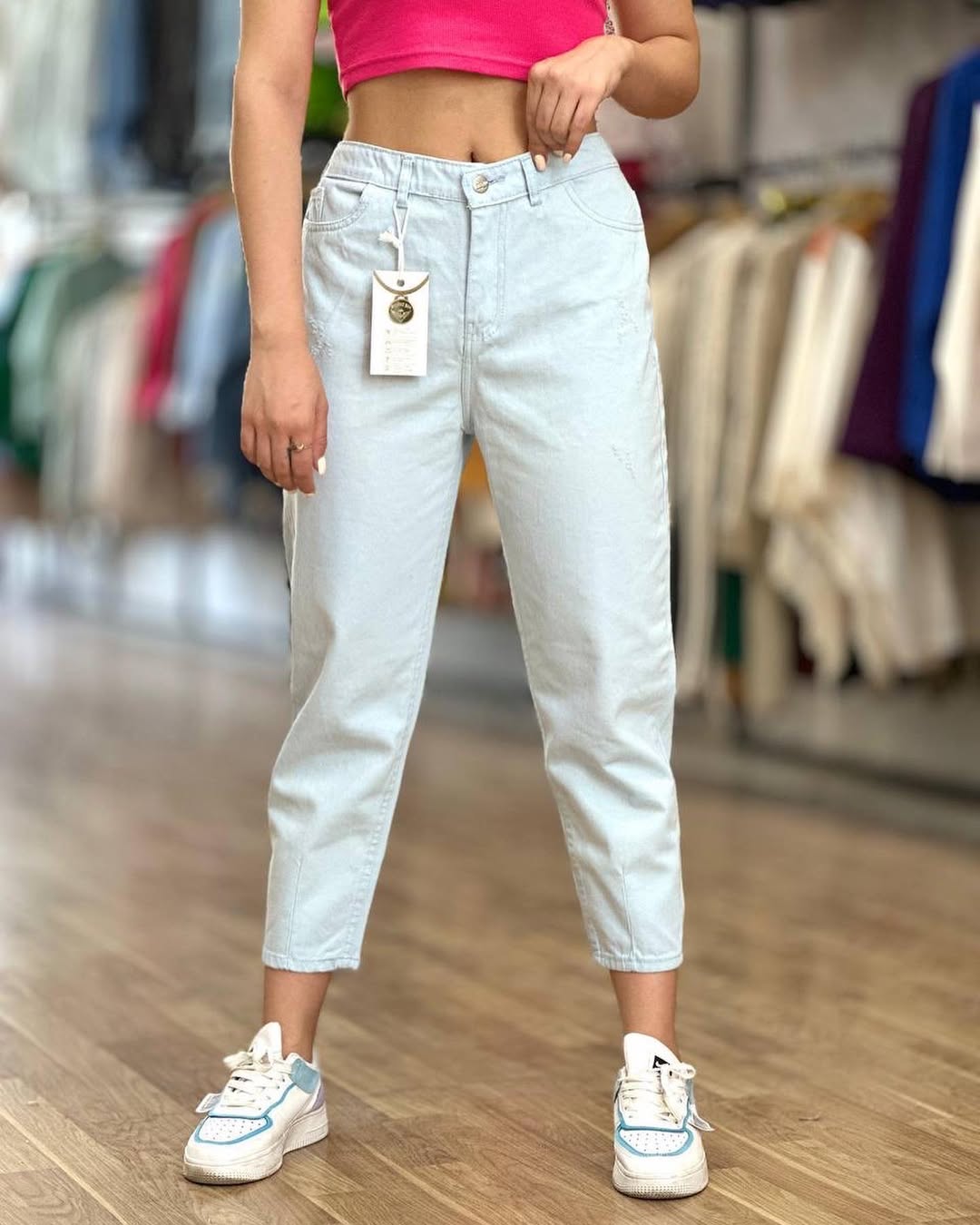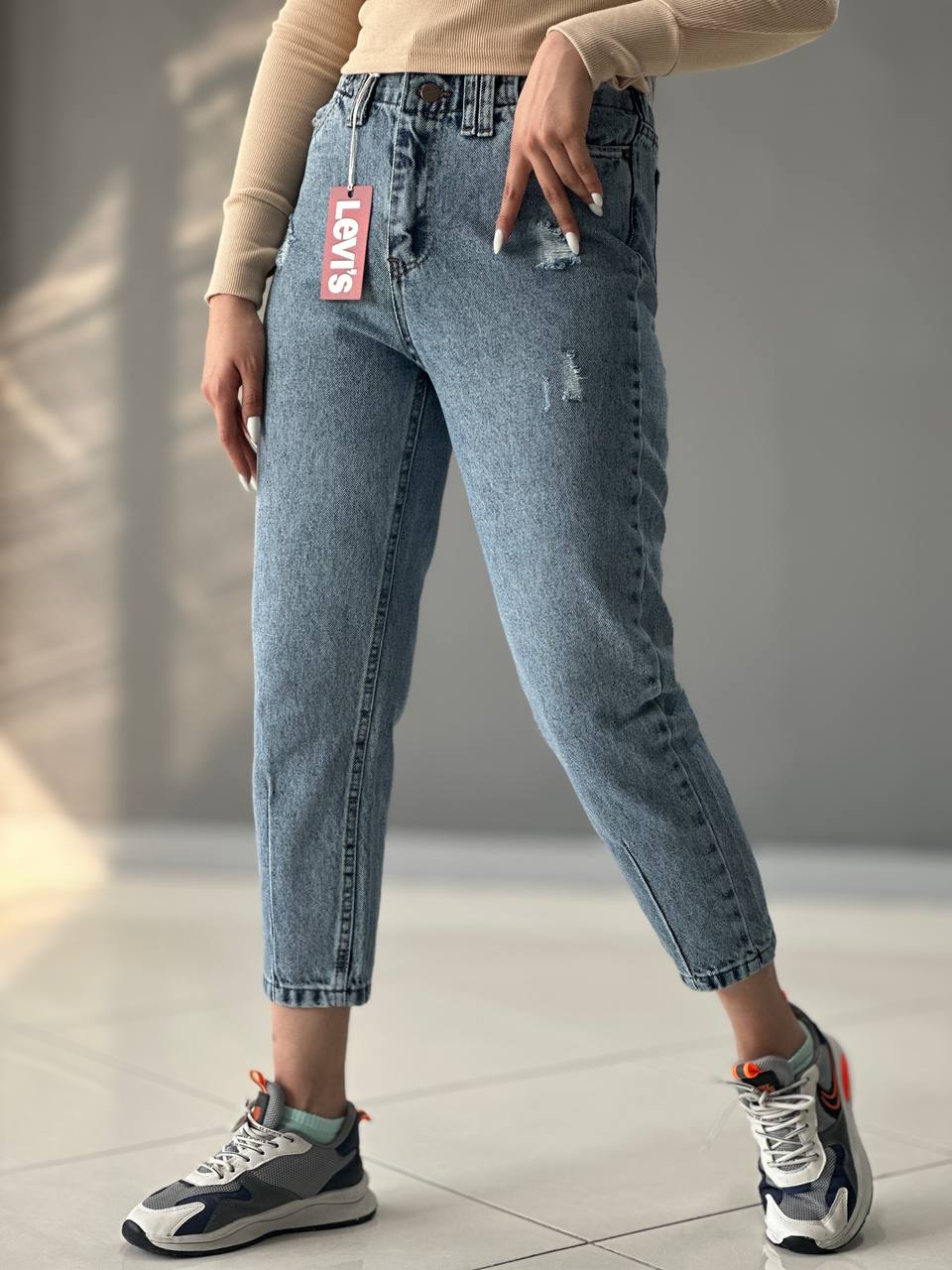 شلوار جین زنانه مام فیت رنگ یخی پشت کمر کش