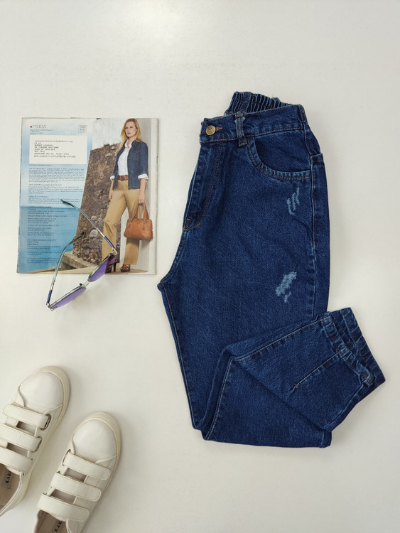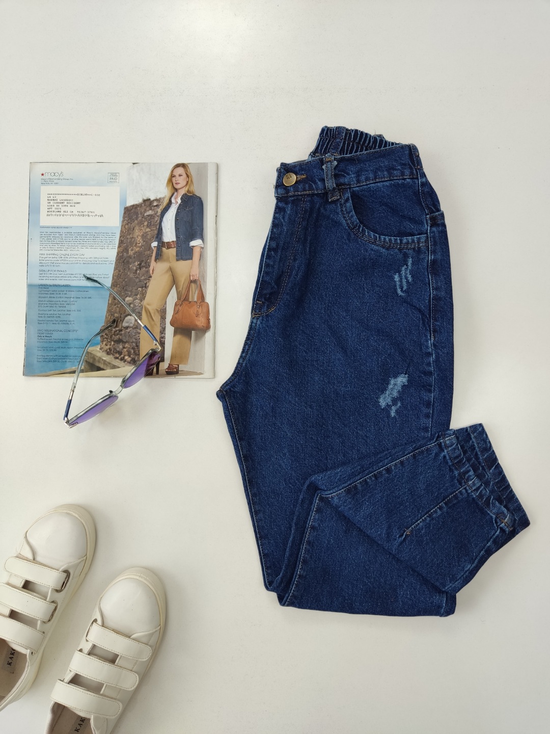 شلوار جین زنانه مدل مام فیت آبی تیره پشت کمر کش